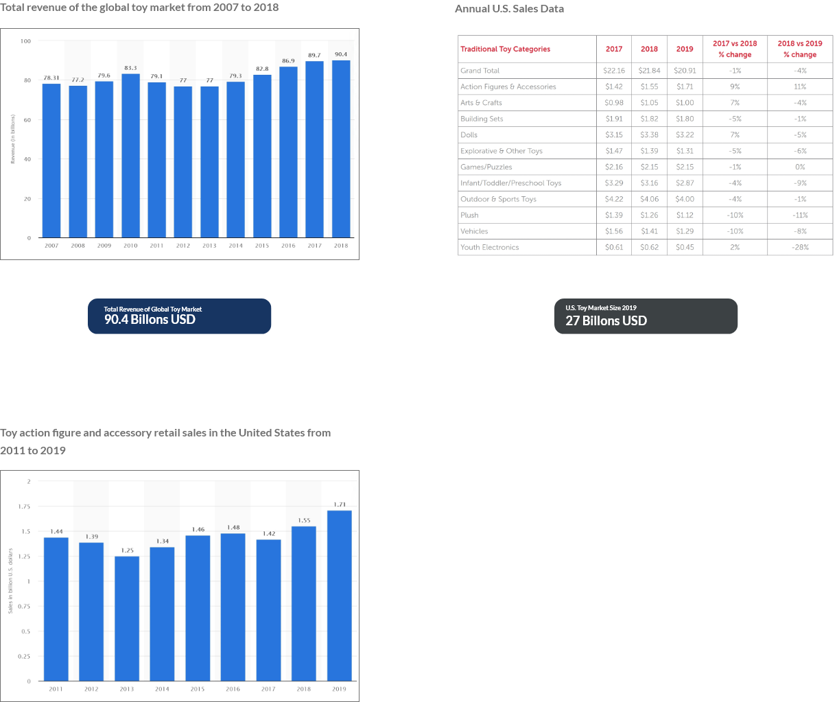 In 2019, retail sales of action figures and accessories in the United States amounted to 1.71 billion U.S. dollars. So based on this data we can see that toy sales continue to grow.
